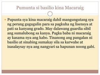 Maagang gumising si Basilio. Ang taong sinabihan na nilalapitan na ng uwak at buwitre. Tungkulin ng mga kurang alamin iyon.